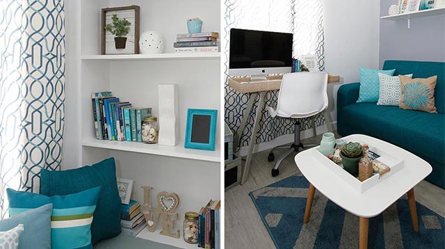 Transforming furniture, space-saving details, and cool colors make this tiny unit a must-see.