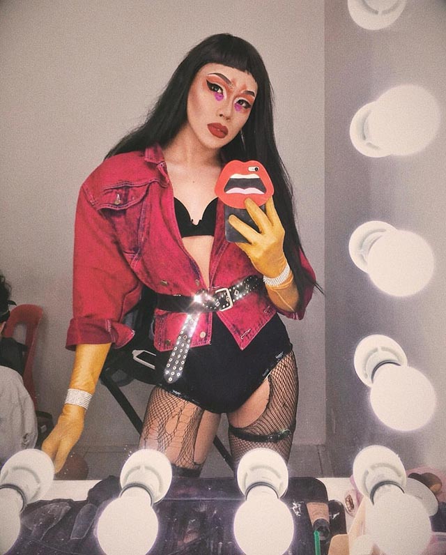 "My number one drag makeup technique would be the classic black smoky eyes. It's easy to do and looks stunning under stage lights. Also, one of the BEST makeup removers is dishwashing liquid. It removes all the heavy makeup so quickly, especially the glue stick on the brows."