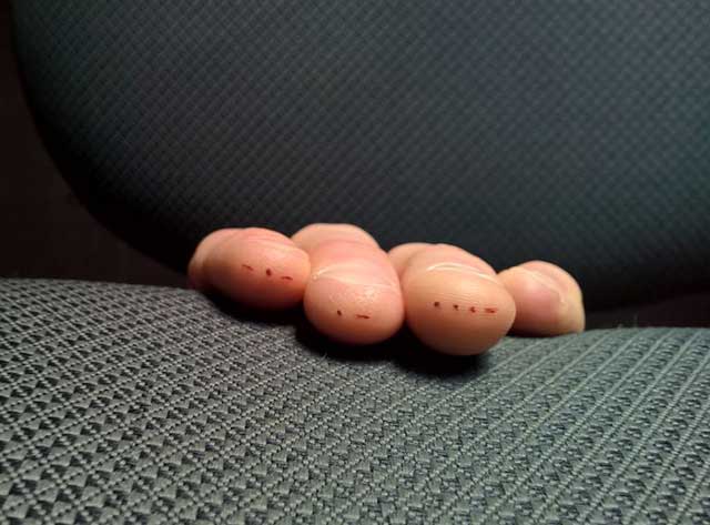 So I got her initials tattooed in morse code on the three fingers that she pokes for her blood sugar tests. I wanted to get a tattoo to remind myself of what she has to go through every day, just to help me remember to be a little more patient with her and a little more kind." – Ras, 46