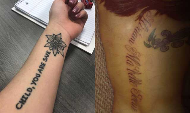 - "On March 10th, I celebrated five years of sobriety! I got small tattoos inside my arm at three months, six, nine, 12, 24 and so on. It was a 'reward' for making it another quarter. My first one was an angel. I have courage, wisdom, a tree for my business logo, the title of my book, MY self, representing all of my accomplishments in sobriety. When I struggle with self-doubt or frustrations, I look at my arm and feel empowered." – Kelley, 39