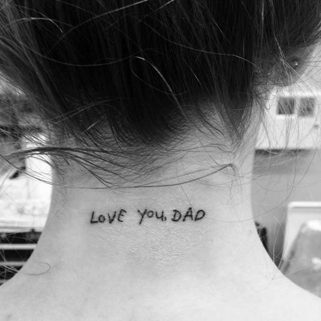 When he was diagnosed with a rare form of Leukemia, my world was disturbed. He approached his sickness head on, putting up an admirable battle. Sadly, we lost him in 2013 and with him, a piece of me was gone. I, along with my brother and sister, went to the tattoo parlor that week and got our father's handwriting on our skin, forever. It was taken straight from my last birthday card from him. Every time I see my tattoo, it's a great reminder to be more like the amazing, strong human my father was." – Shea, 26