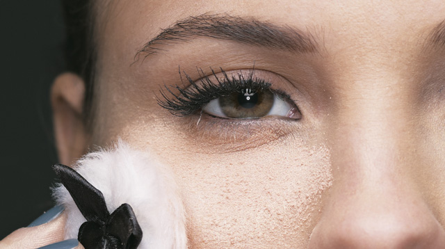 Before masking your panda eyes, dab a scant amount of face oil on the undereye area, and let your skin absorb it to prevent creasing. Grab a salmon-hued concealer to counteract blue and brown circles. Apply in an inverted triangle shape, starting from the outer corner, down to the sides of the nose, and up the inner corner. Set with a thin veil of translucent powder.