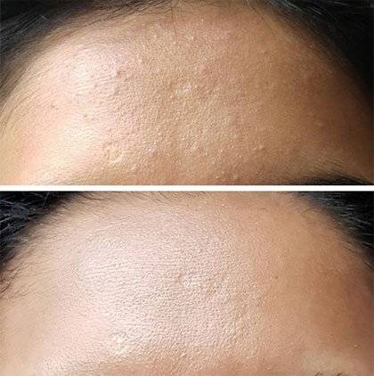 "Finally got rid of my closed comedones with COSRX AHA 7 Whitehead Power Liquid!” read the title of the post, right next to a before-and-after photo of the user's forehead, which has a smattering of clogged pores before treatment, next to a totally clear forehead after.