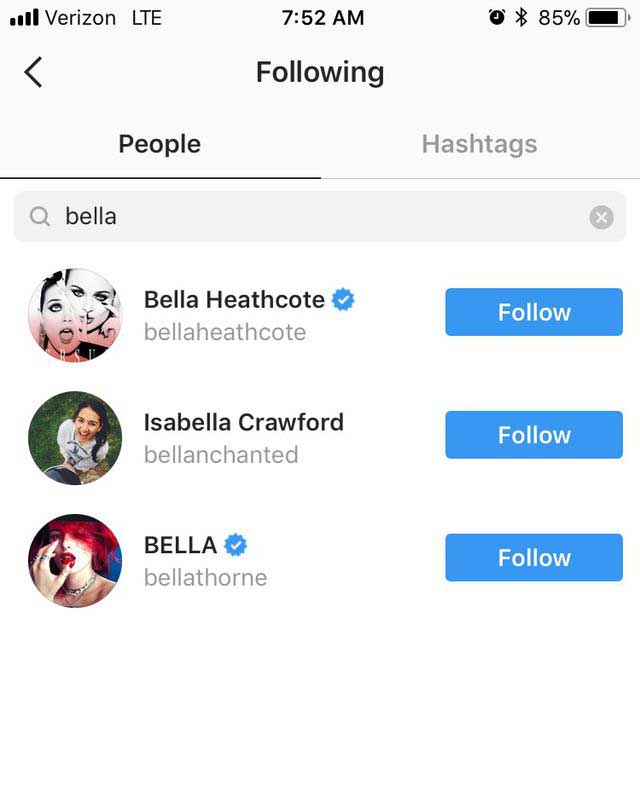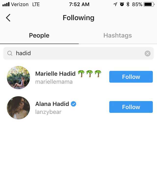 A quick search of whether she follows Bella, Gigi, or Yolanda Hadid comes up zip, nada, nope. See? Here's what happens when you search her followers for Bella, as an example: