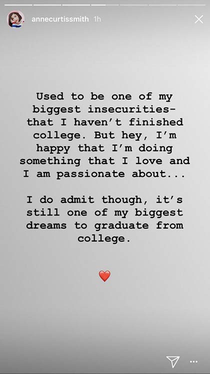 She continued, "Used to be one of my biggest insecuritiesāthat I haven't finished college.Ā But hey, I'm happy that I'm doing something that I love and I am passionate about...I do admit though, it's still one of my biggest dreams to graduate from college."