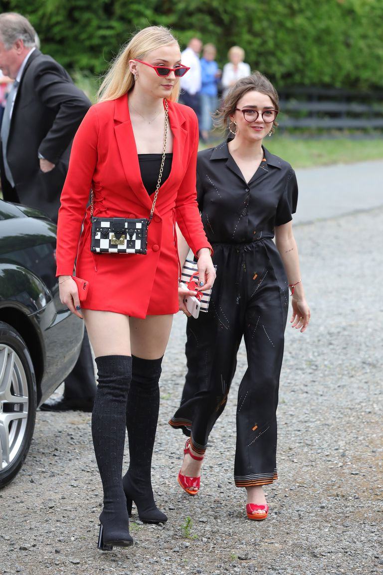 To the actual event, she chose a bright red mini coat dress and tiny red sunglasses, which Kanye would surely approve of. It's a look! She hung with TV sister, Maisie Williams, who looked chic AF in a black jumpsuit.