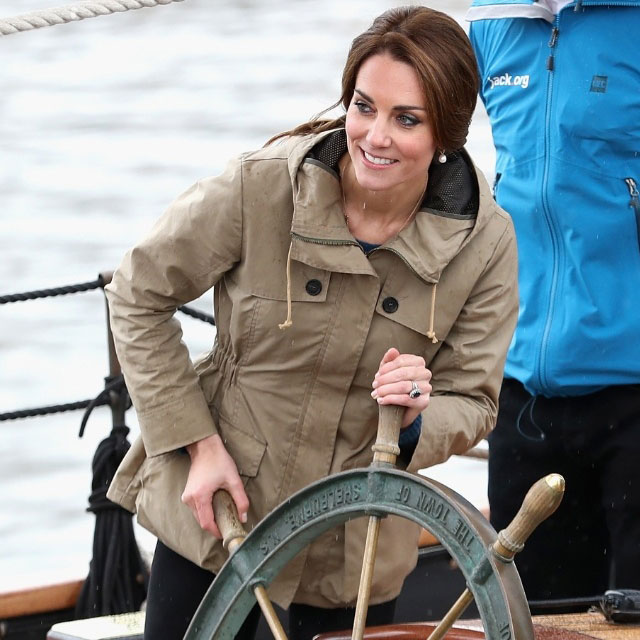 Irina's emerald rock looks like it could be based off of Kate Middleton's famous sapphire accessory. Both pieces feature a large, colorful, oval center stone surrounded by a circle of smaller diamonds on a narrow band.