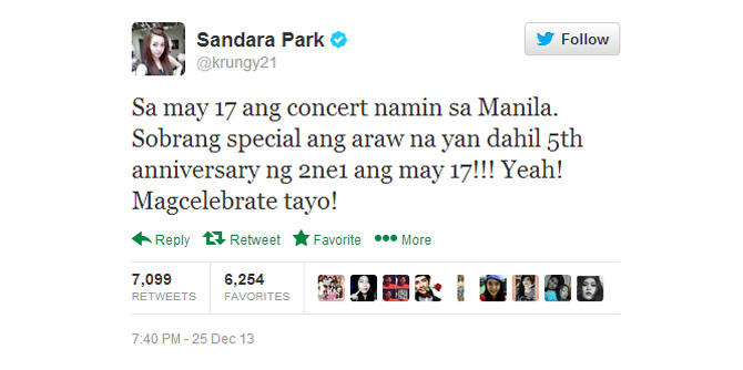 4 This one’s for you K-Pop fans! Sandara Park has confirmed on her Twitter account that 2NE1 will be performing in Manila on May 17, 2014. (PEP.ph)