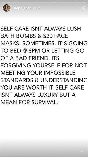 The post reads, "Self-care isn't always lush bath bombs & $20 face masks. Sometimes, it's going to bed @ 8pm or letting go of a bad friend. It's forgiving yourself for not meeting your impossible standards & understanding you are worth it. Self-care isn't always luxury but a mean for survival."