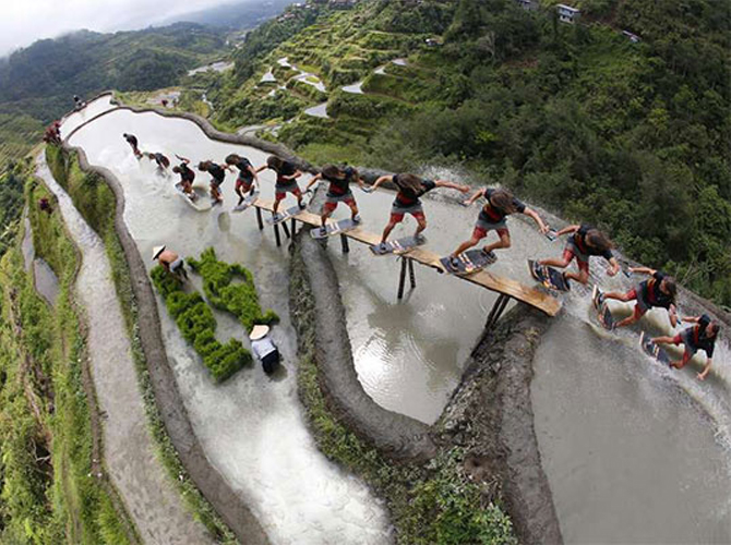 Check out American wakeskater Brian Grubb performing a wakeboarding challenge in the Banaue Rice Terraces. Though some concerned Filipinos criticized the stunt for jeopardizing the famous terraces, Grubb reassured viewers that he asked permission from mumbakis (spiritual leaders of the Ifugao) before performing the stunt. (manila.coconuts.co)