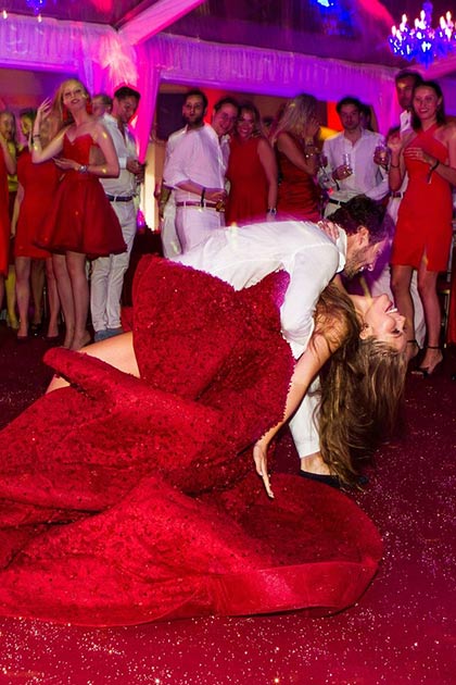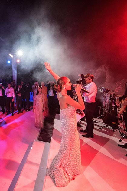 The celebratory weekend kicked off with a red-and-white "pasta and love" dinner on the eve of the wedding where men sported white and women dressed in red. Swarovski wore a form-fitting red gown—also designed by Cinco—with a plunging neckline and voluminous train.