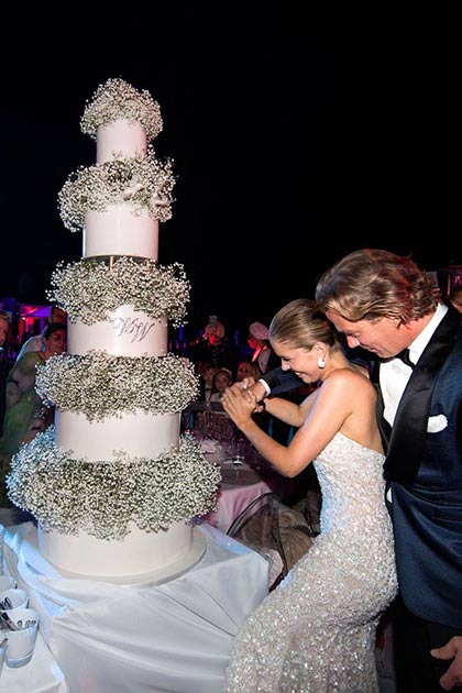 The party continued at Hotel Falisia in Portopiccolo, where the couple cut into a five-tier cake and guests watched fireworks. Swarovski also changed to into a new sleeveless dress.