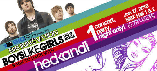 You read that right! Boston band Boys Like Girls rocked the house back to back with Hed Kandi at the SMX Convention Center last Wednesday, January 27, 2010, with an energetic set packed with all their hits. It didn’t matter that it was a school night; kids of all ages packed the hall to listen to hits like "Thunder" and "Hero/Heroine." They even knocked the VVIP barricade down when frontman Martin Johnson asked everybody to come closer to the stage (and then almost dove into the crowd)!