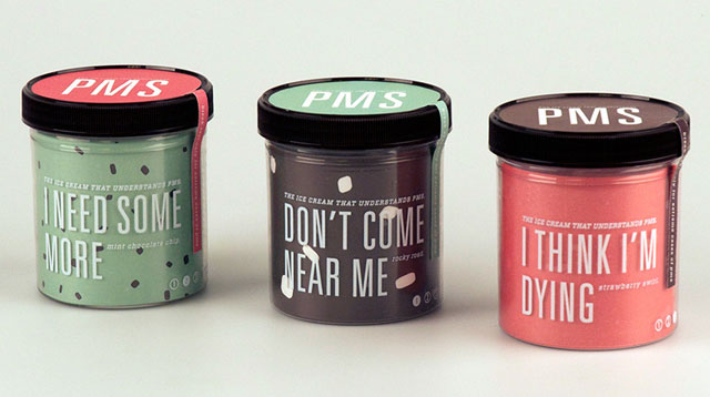 Texas-born graphic designer Parker Jones created packaging for a non-existent ice cream line targeted towards women who are undergoing PMS. The flavors, which include Rocky Road, Strawberry Swirl, and Mint Choc Chip, are housed in little tubs with the cutest elements: