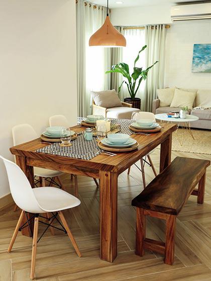 The solid acacia dining table steals the spotlight in the dining area. To further highlight the piece, the rest of the pieces in the nook are kept in light colors—as seen in the sea-green dinnerware and the white Eames-inspired chairs. To be able to accommodate her friends and family in the unit, a sturdy wooding bench was also added.
