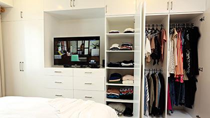 Instead of having an ordinary console table or cabinet to house the TV, a closet takes up the space at the foot of the bed. The TV is kept within a niche, while the rest are cabinets and drawers meant for clothes and other belongings. Having a multipurpose piece works well in small homes as it helps the owners maximize the available space while controlling clutter.