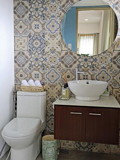 Janine and Theressa chose to keep the powder room compact in order to allot more space for the living area. Even if it's tiny, the private space still packs a punch in terms of style and function. A patterned wallpaper livens up the wall, while toiletries and towels are properly corraled into chic containers.