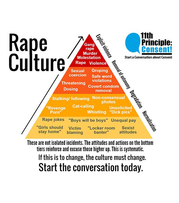 The below graphic by 11th Principle: Consent, founded by members of the Burning Man community after sexual assault issues at the event, visualizes how violence against women becomes entrenched in our culture. Crossing the barrier from locker room banter to taking non-consensual photos may seem far off for you, but for certain impressionable, moral compass-lacking young men, it could be just another step towards even more serious behavior. If anything, it’s good to be aware of the impact our speech and actions have on others.