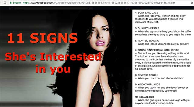 In one free online lesson entitled, “11 Signs She’s Interested In You,” they wrote: [sic] “KINO COMPLIANCE—When you touch her and she doesn’t react or give negative feedback by your touch.”