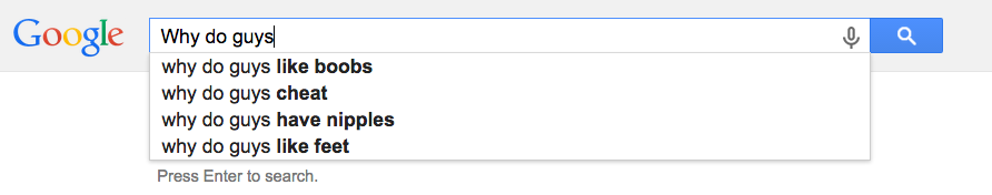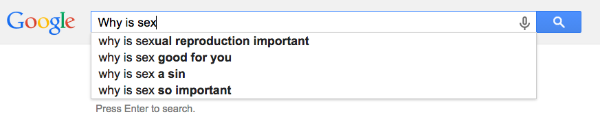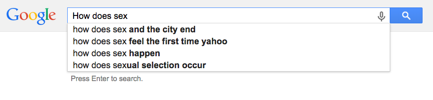 There are a lot of, um, worrisome suggestions when you Google things like "sex" or "men," and see how the phrases auto-complete. The questions that pop up apparently need answering since enough people are searching them online to make them the top responses. So I've taken it upon myself to serve up some help to those of you madly Googling your darkest insecurities at 2 a.m. (OF NOTE: I am not a doctor or a scientist.) Here we go.