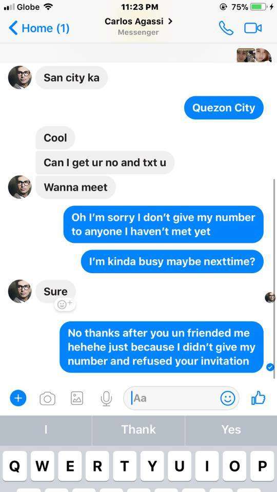 Harassment is harassment, regardless of physical appearance. Anyone is free to ask out any woman they like, as long as they do so politely—and steps away when the woman refuses or doesn’t reply. Silence doesn’t mean “Go ahead, message me again.” In a society where women have literally been raped or killed for rejecting men (read this, this, and this), a woman’s seenzone is a quiet “Please don’t message me anymore.” And if men like Carlos Agassi don’t understand that now, they never will.