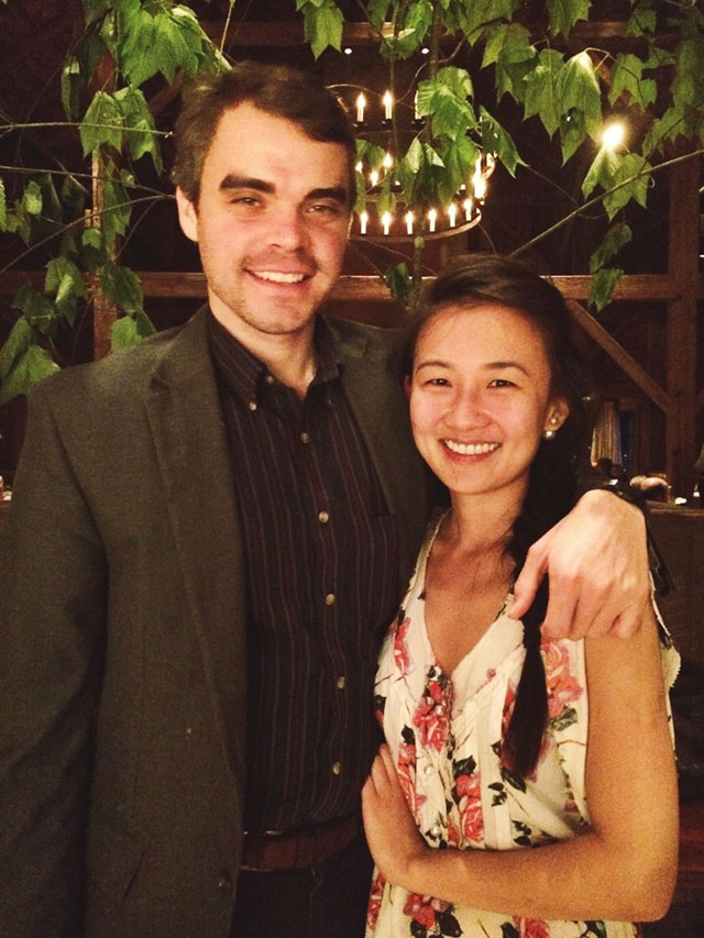 “We met on OKCupid and had our first date at a bar. I wore a Costello Tagliapietra for Uniqlo dress and had my hair down. I don’t think I wore much makeup. Maybe just a cateye,” said Helin.