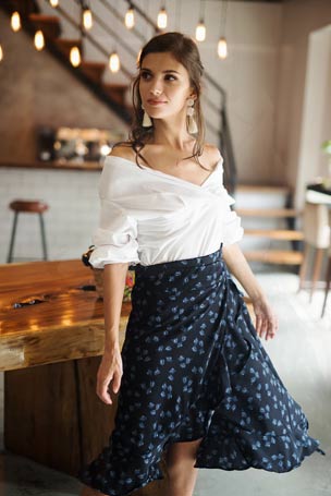 Wrap tie skirts are a presko alternative to high-waist jeans, giving you a chic cinched waist and an over-all polished look.